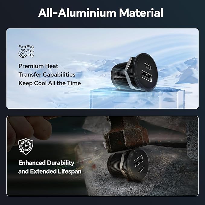 - Aluminum Construction & Safety: Crafted from robust aluminum, Acegoo's USB outlet excels in heat dissipation & durability. Integrated with smart protection chips & fuses, it safeguards your devices, enabling hassle-free travels