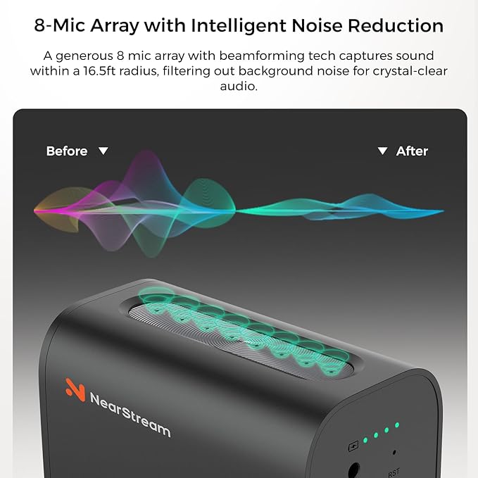 - 【8-MEMS Mic Array with AI Noise-Canceling & Crystal-Clear Sound Delivery】: Equipped with an 8-MEMS microphone array, this livestream camera captures 360° audio within a 16-foot radius. The advanced AI noise-canceling algorithm ensures crystal-clear sound by eliminating background noise. Additionally, the webcam for streaming supports external audio input through a 3.5mm jack and allows background music integration via the NearStream APP.