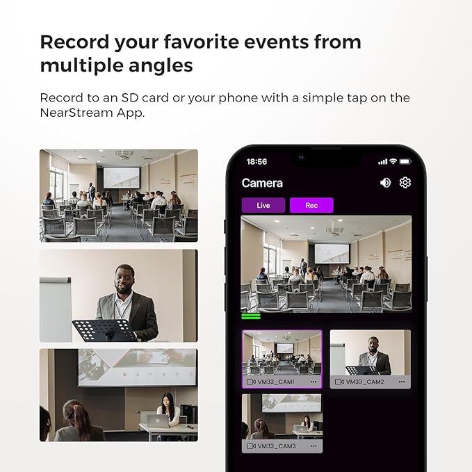 - 【Multi-cam Support for High Efficiency】: Link up to three VM46 wireless streaming cameras to create efficient, high-quality streams or recordings from multiple angles, ideal for capturing dynamic sports events, church activities, academic lectures, and more. (NOTE: For storing multiple videos, insert a microSD card (32GB to 256GB, write speed 10MB/s, class: V10 or higher) formatted in FAT32 into the VM46.)