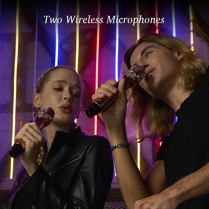 - 【Two Wireless Microphones】Our karaoke speaker with 2 microphones offer you the freedom to perform without limits. Engineered with state-of-the-art digital audio technology and deliver pristine sound quality that captures every note and nuance of your voice.