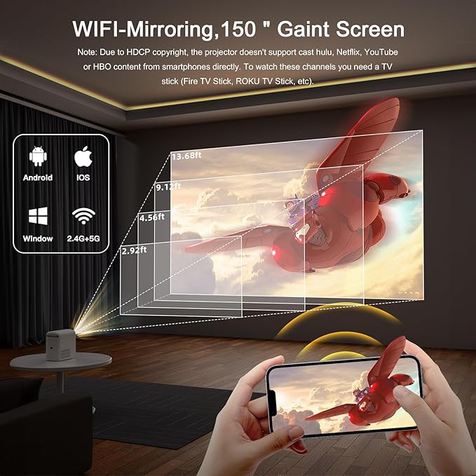 - Seamless Wireless Connectivity – Built-in WiFi for smooth screen mirroring and Bluetooth 5.2 for effortless pairing with speakers, soundbars, and headphones for a superior audio-visual experience. Note: Due to HDCP copyright, the projector doesn't support cast Netflix or YouTube content from smartphones directly.To watch these channels you need a TV stick (Fire TV Stick, ROKU TV Stick, etc).