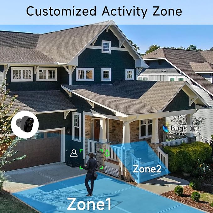 - 【Smart 24/7 Defense with Instant Alarms】 1-2 second faster alerts: Dual-band WiFi beats 2.4G-only cameras. Outdoor camera instantly alerts your phone when motion is detected and then trigger a 110dB siren and blinding spotlight via app to scare off threats. Set ""safety zones"" to monitor high-risk areas (mailbox, garage) and reduce false alerts.