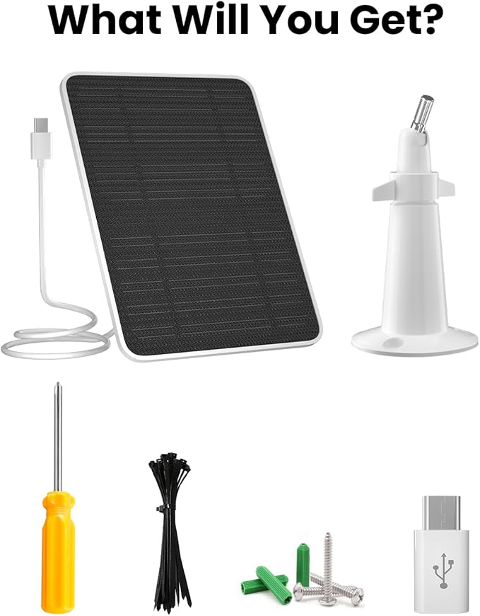 - 【Package Included】The solar panel kits are made of high-quality and environmentally friendly materials, including 2 solar panel with 10ft cable, 2*360° adjustable mounting bracket, 2*screw bag, 160*cable tie, 1*screwdrive. Please note that the charging efficiency depends on the intensity of the sun's rays and the speed at which the outdoor cameras consume power. If you have any questions, feel free to contact us, your satisfaction is always our aim.