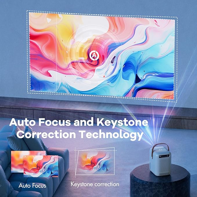 - 【Innovative Auto Focus & Portable Design】Say goodbye to traditional manual focusing, Effortlessly getting a clear rectangular image in 5s after powering on! Without manual focus avoid eye fatigue. With 6D auto-keystone system, QIGEEKU smart projector can automatically detect changes and movement in the environment, adjusting the picture accordingly to ensure it stays clear. This projector with charming shape, will help you to carry it in anywhere.