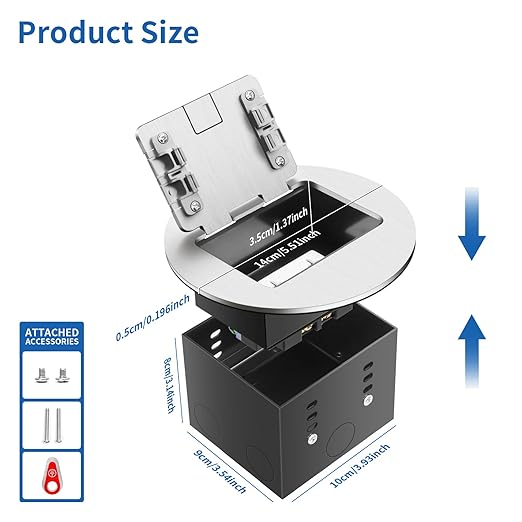 - Dimensions:The floor electrical outlet box surface is a circular shape with a diameter of 5.51", and the base size is 3.98" * 3.66" * 3.15".