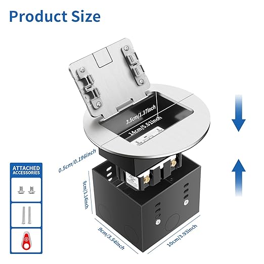 - Dimensions:The floor electrical outlet box surface is a circular shape with a diameter of 5.51", and the base size is 3.98" * 3.66" * 3.15".