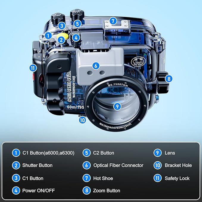 Sea frogs Waterproof Camera Housing Compatible with Sony A6000/A6300/A6500 IPX8 60m/196ft Maximum Diving Depth Underwater Camera Case for Diving, Surfing, Rowing, Skiing