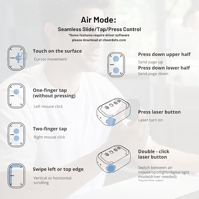- 【Ultimate Presentation Clicker with Laser Pointer】Cheerdots2 Air Mouse is an ideal assistant to have in your meeting room, classroom, or lecture. It offers two modes of operation: Desktop Mode and Air Mode. In desktop mode, it serves as a regular air mouse with added touchpad features. In Air Mode, it transforms into a handheld smart device controller and professional presentation remote clicker with two content highlighting options. You can tap or slide the surface to move the cursor, slide the side to flip the pages of your presentation and switch between spotlight and digital light to highlight what you are saying.