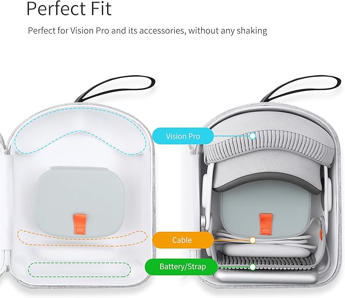 - [Perfect Fit] Specially designed for Vision Pro, it fits perfectly with the headset, battery and strap (Including all size of Light Seal), the inside will not shake even if you shake it hard.