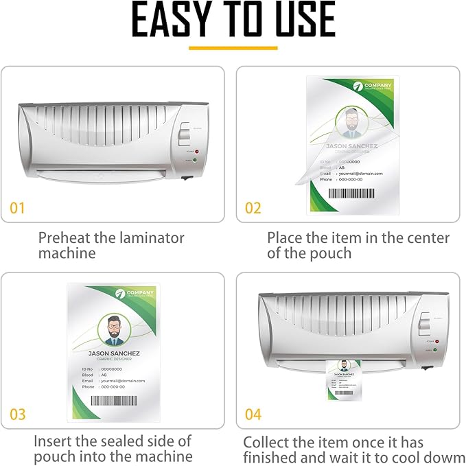 - Widely Applicable: the thermal laminating pouches can be applied to various applications, so you can use them to seal and protect your photos, certificates, brochures, documents, menus, engineering drawings and many other important items, to avoid damping, fading, tearing, and to prolong their preservation time