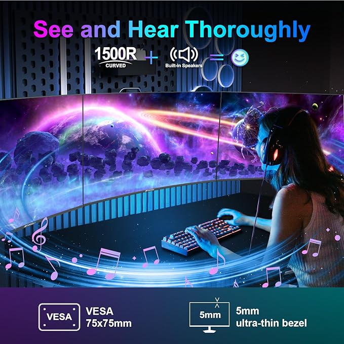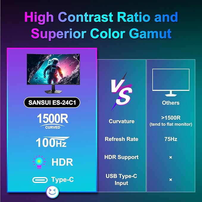 SANSUI Curved Monitor 24 inch 100Hz USB Type-C Computer Monitor with Built-in Speakers- MPRT 1ms,Adaptive Sync,HDR,1500R,VESA 75x75mm Compatible, for Home and Office(ES-24C1)