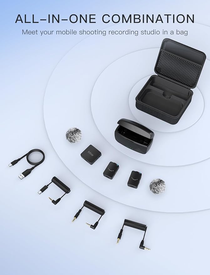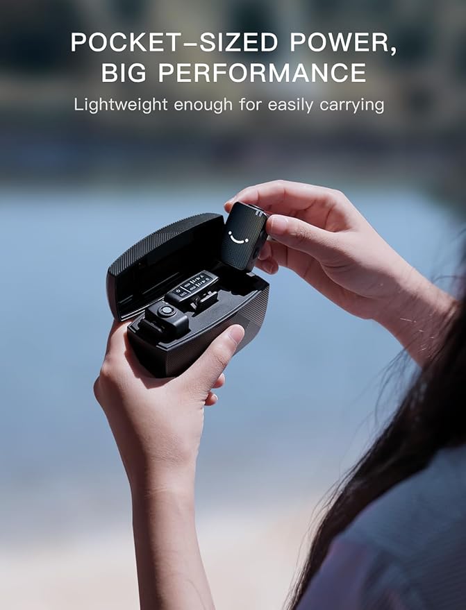 - [Portable Perfection, Record Anywhere] The lapel microphone wireless set is friendly to your pocket or handbag , ready to go wherever you need it. No more struggling with bulky equipment, just clip wireless lav mic on the shirt collar, and start recording anytime, anywhere. You can freely make content creation on the move. The podcast wireless mic for iphone 15 is ideal for event videographers who need to be agile, moving from one shot to the next without awkward gear holding them back.