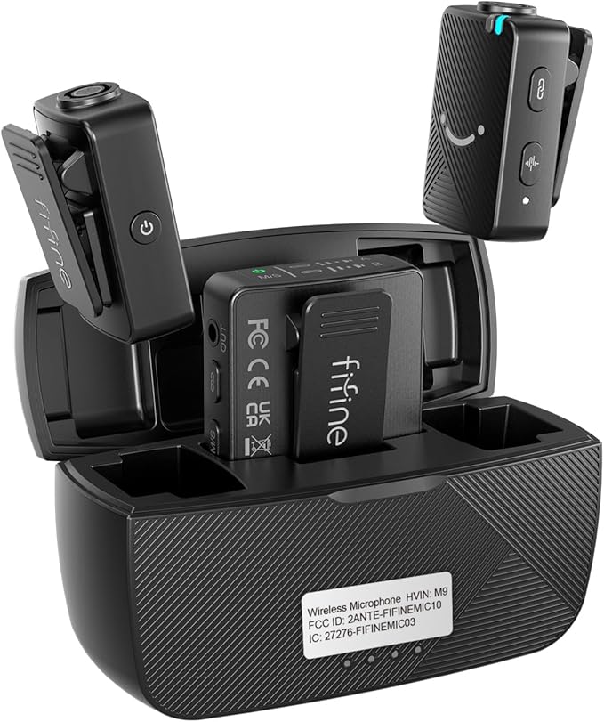 FIFINE Wireless Lavalier Microphone for iPhone/Android/Camera, 2 Pack Cordless Lapel Mic System for Vlog Recording Video YouTube/TikTok Interview, Condenser Clip-On Microphone with Charging Case-M9
