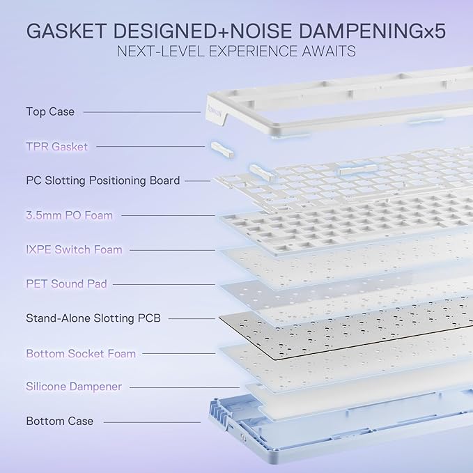 - Noise Dampening x 5 - Equipped with 3.5mm PO foam, IXPE switch foam, PET sound pad, bottom socket foam, silicone bottom pad along with the silicone gasket. Significantly reduce the hollow noise, creating dampened and ultra-clean typing acoustics, making each keystroke satisfying and comfortable.