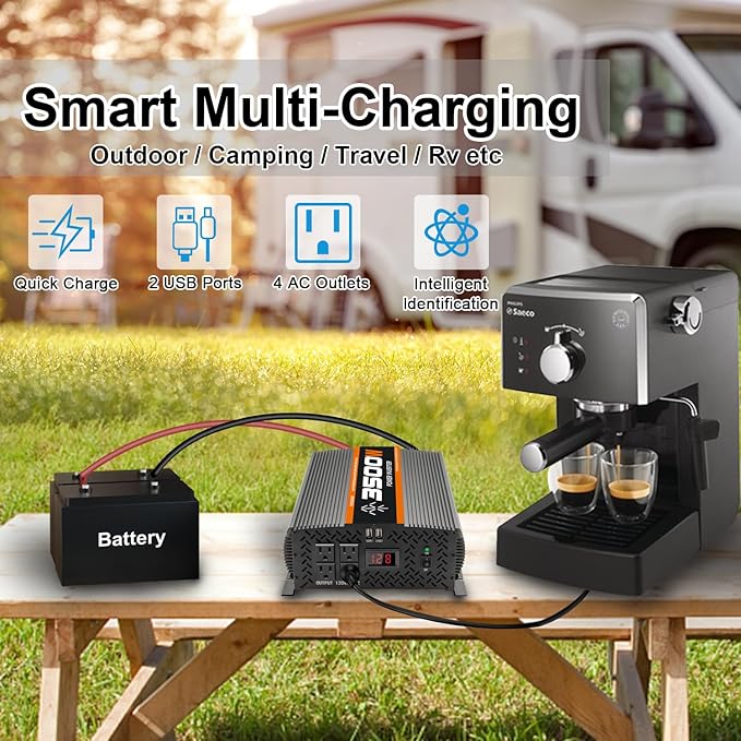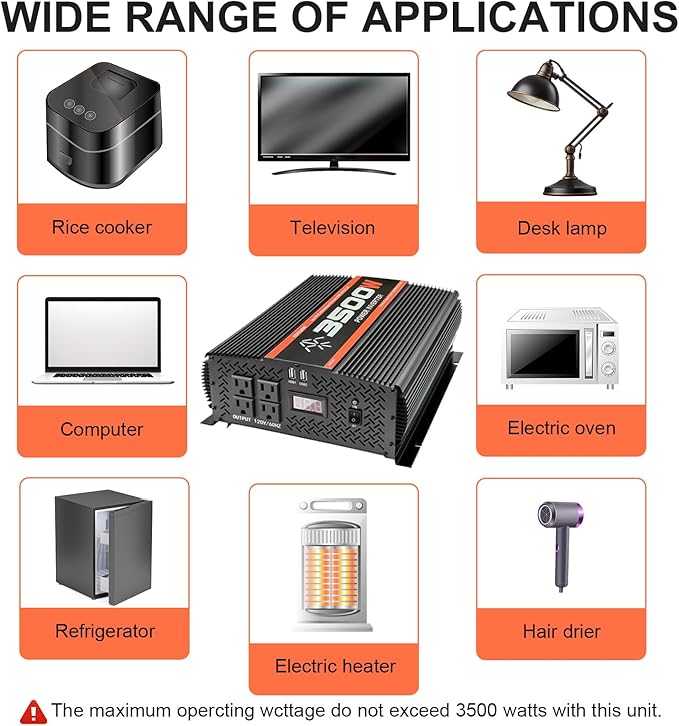 - {Multiple usage scenarios} You just need to connect the 3500W inverter to the 12V battery through a cable, and you can use 110V AC power anytime and anywhere. Ac appliances or devices for power outages, emergencies, hurricanes, holidays, cars, RVS, trucks, solar power, remote workplaces, or any place that requires AC power, such as TVS, ovens, floodlights, laptops, DVDS, players, cell phones, ipads, PSPS, cameras, etc.