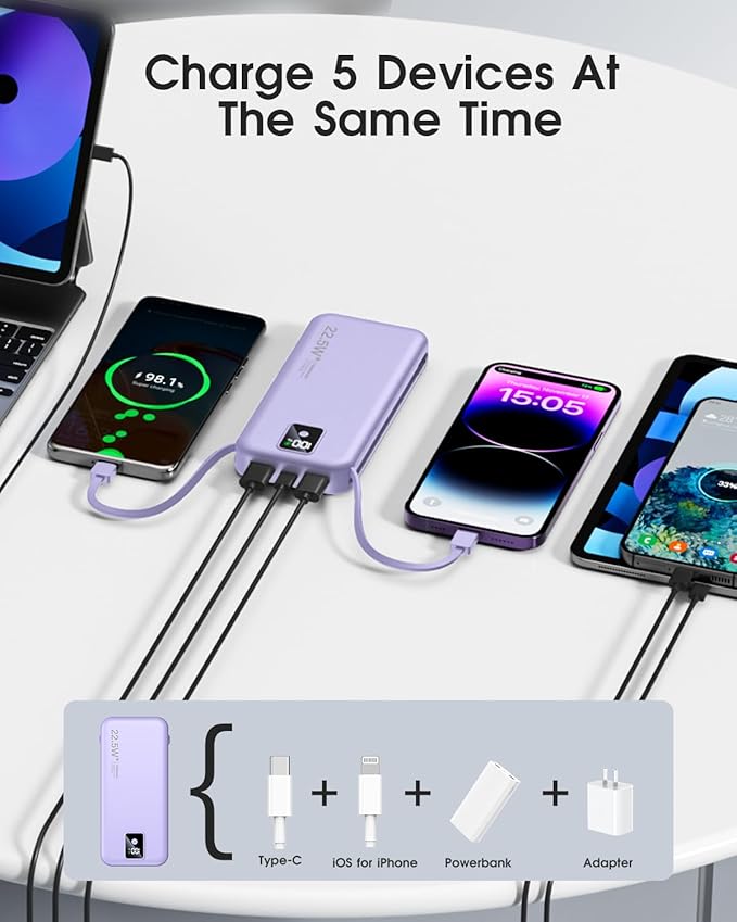 - 【Wide compatibility with built-in cable】: The portable battery charger uses a built-in charging cable for charging and is compatible with iphones, Android devices, and tablets. You don't need to use an additional cable, just use the built-in charging cable to connect to your device for fast charging. You can also use the USB-A and USB-C ports to charge your device. Can charge up to 5 devices at the same time.