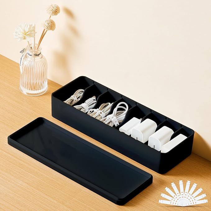- Detachable Design: the partitions of cord storage organizer box are detachable, you can adjust the size and space of the compartment according to your needs, practical and visual design assists you in organizing your space well, no more messy wires and cables on your desk; Meanwhile, we provide you with 20 silicone wire ties to store over 20 cables and wires, easily meeting your various needs