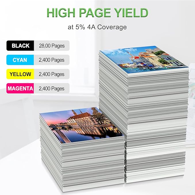 - 【High Page Yield】Up to 2,800 pages per black and 2,400 pages per color at 5% coverage (Letter/A4).