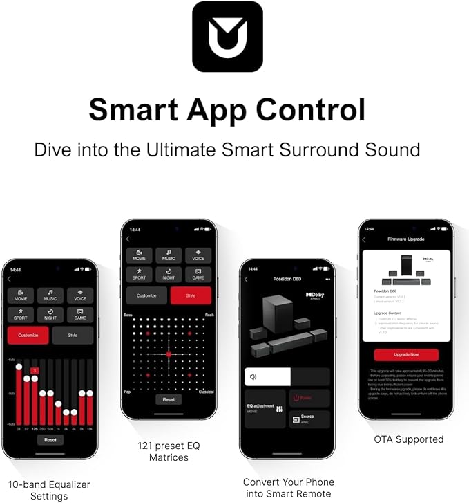 - Smart Control at Your Fingertips: The ULTIMEA Smart App gives you full control over your home audio sound bars, offering OTA updates and customizable settings. Whether using it as a soundbar for smart TV or for an advanced Dolby Atmos soundbar experience, the Poseidon D80 stays up-to-date with the latest features for superior sound.