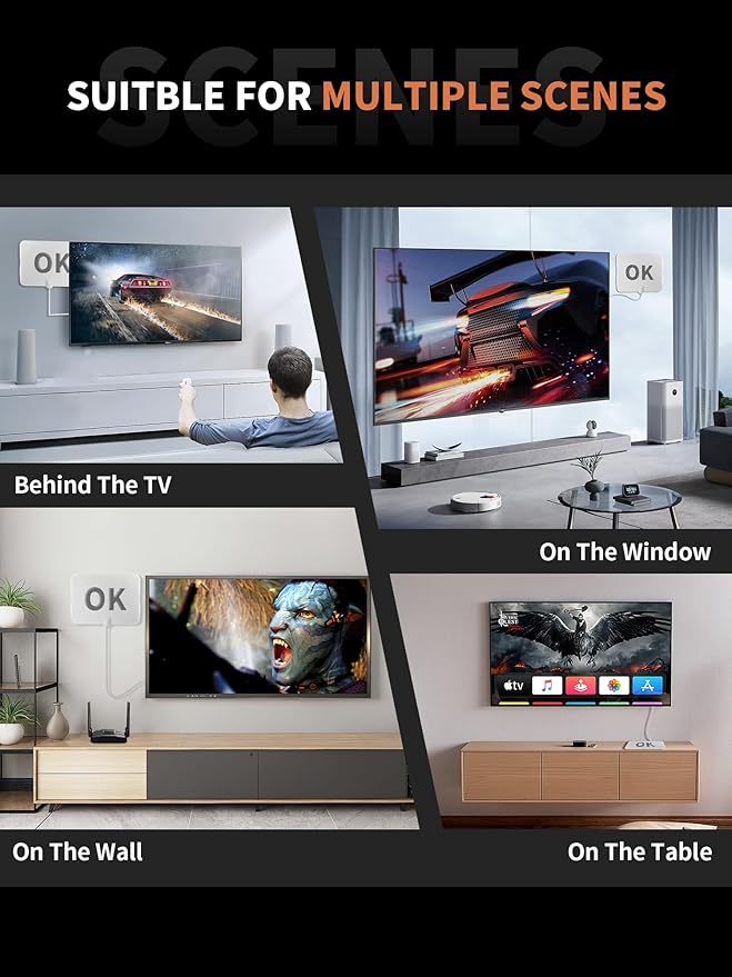 - 【HD TV CHANNELS】Our indoor digital TV antenna has a built-in smart IC chip that supports 4K, UHD and 1080P TV channels, allowing you to access HD video and TV channels in your area.