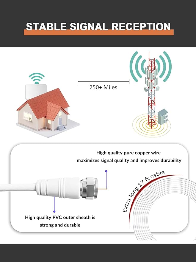- 【16 FT LONG DISTANCE RECEPTION】This TV antenna with amplifier signal booster, can receive signals up to 900 miles long and can be placed where the signal source is. 16.5ft coaxial cable, stable received TV signal, convenient for your use.