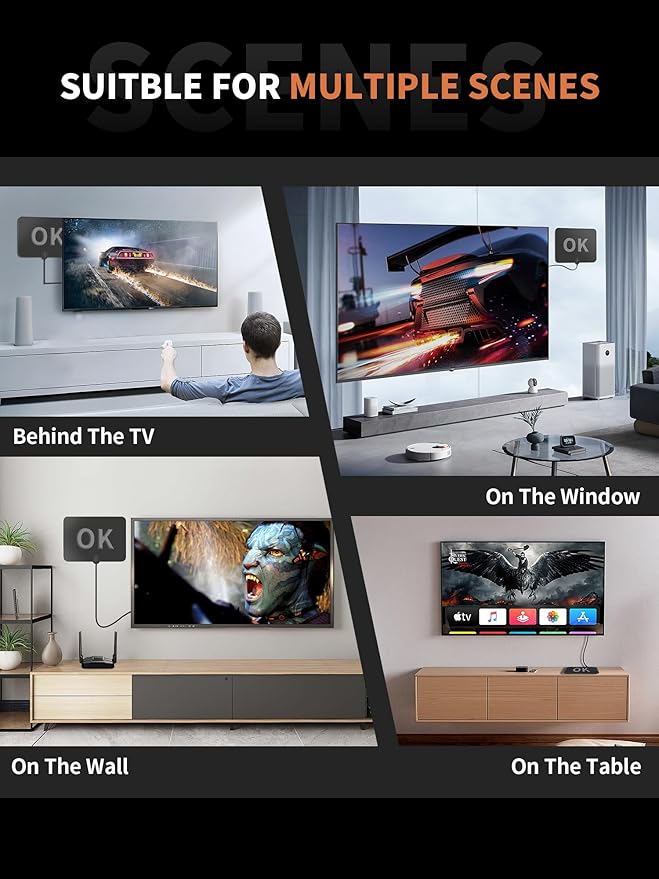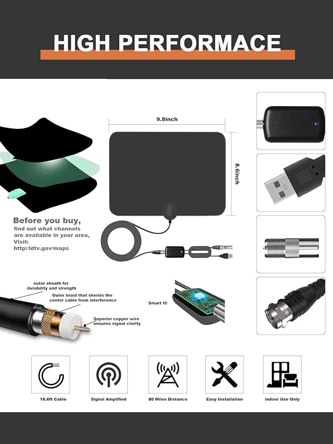 - 【HDTV CHANNELS】Our indoor digital TV antenna has a built-in smart IC chip that supports 4K, UHD and 1080P TV channels, allowing you to access HD video and TV channels in your area.