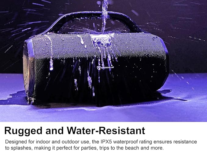 - RUGGED AND PORTABLE: IPX5 water-resistant design with a carry handle and rubber input cover for added durability; roller volume knob for easy control.