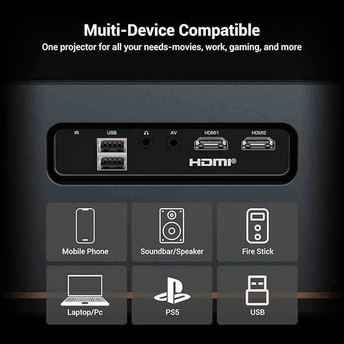 - [MULTIPLE VIEWING OPTIONS] The projector is equipped with HDMIx2, USBx2, AV, and a 3.5mm headphone jack, making it compatible with TV sticks, Chromecast, Roku, phone, ISO/Android, PC, Laptop, PS4, PS5, and more, catering to various needs. With a 300" display and 50% zoom function, it meets projection requirements for different spaces. The projector is perfect for home theaters, backyard movie nights, gaming, yoga, birthday parties, music events etc.