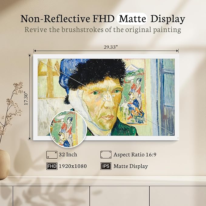 - 32 Inch FHD Matte Screen and 64GB Memory: BSIMB digital picture frame featured with 32 Inch 1920x1080 FHD IPS screen, the digital photo frame displays stunning and clear images, which can revive the brushstrokes of the original painting. The digital picture frames has a Type C connector, and it can be expanded (up to 64GB) by connecting a USB stick and Micro SD card (TF card) via a converter (not included). This digital frame also with a remote control making it perfect for older or less tech-savvy people to operate. NOTE:The battery type for this remote is AAA+, not included in the package.