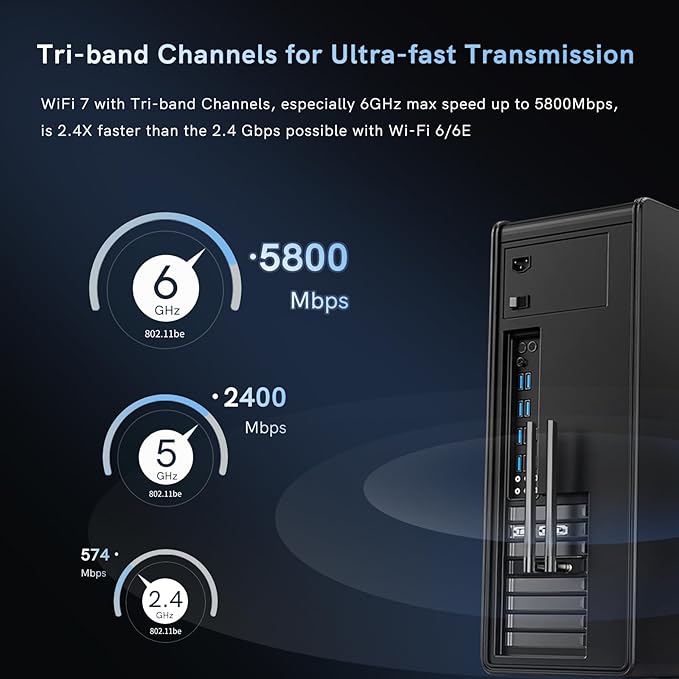 - 【WiFi 7 with Tri-band Channels➤】Support Tri-band(2.4G, 5G, 6 GHz) Transmission, 6GHz maximum data rate of almost 5.8 Gbps, which is 2.4X faster than the 2.4 Gbps possible with Wi-Fi 6/6E and could easily enable high quality 8K video streaming, 5Ghz data rates up to 2400Mbps, 2.4GHz date rates up to 574Mbps.
