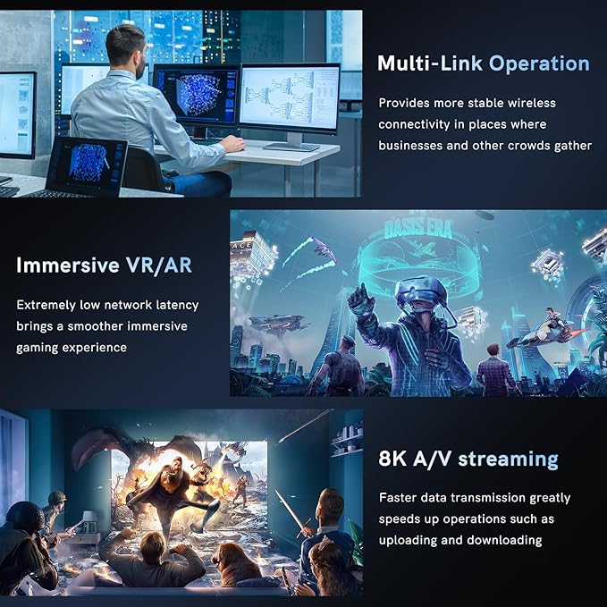 - 【Application of WiFi 7➤】The new features introduced by WiFi 7 greatly improve data transmission rates and provide lower latency, while also being able to adapt to more complex and crowded network environments. It will become the core of cutting-edge application scenarios such as 4K and 8K video, VR/AR, social gaming, immersive AR/VR, interactive telemedicine, and cloud computing.