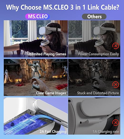 - Wide Compatibility: Compatible with Meta Quest 3s/3/2/Pro/1 VR headsets, plug and play. The upgraded 3-in-1 charging cable adds a Type-C charging port, which can provide enough power for Quest 3s/3/2 when playing games, making it easy to play games continuously all day without worrying about low battery warnings.