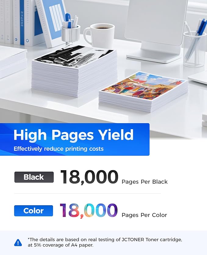 - The latest chip version: The JCTONER toner cartridges are equipped with the latest version of built-in chips, ensuring perfect compatibility between each toner cartridge and the printer. This enables you to print efficiently while maintaining stability and reliability, making installation convenient without the need for manual adjustments. All JCTONER toner cartridges have undergone strict quality testing and have obtained ISO9001 certification. High-quality toner cartridges can meet the demand for high printing volume. The fine toner ensures clear and stain-free printing results and extends the lifespan of the printer. You can purchase with confidence.