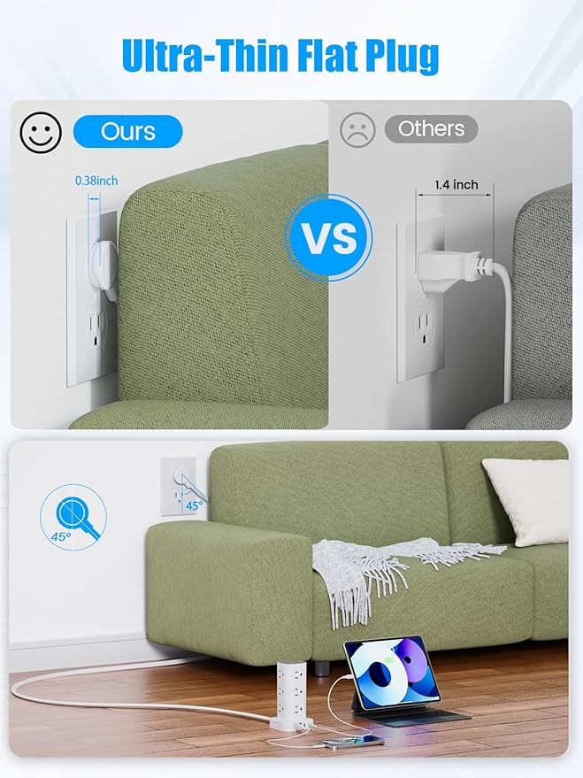 - 【Flat Plug Extension Cord】Featuring a 0.31 in ultra-thin flat head, this flat plug power strip seamlessly fits into narrow spaces and can be discreetly tucked behind sofas, beds, or nightstands, sitting flush against the wall. The 45° angled design also allows for additional plug space underneath without obstruction.