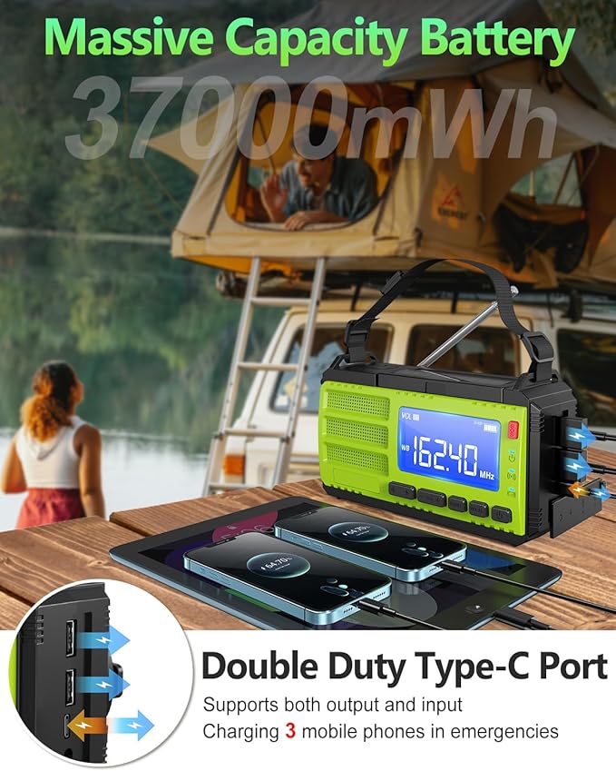 - [Power Up with 37000mWh Battery & 3 Outputs]: This upgraded hand crank radio comes with a robust 37000mWh battery and 3 outputs (The Type-C port supports both output and input) , making it an essential tool during power outages. The hand crank radio can charge 3 mobile phones simultaneously, ensuring you have the power to communicate with loved ones or access emergency services when it matters most.