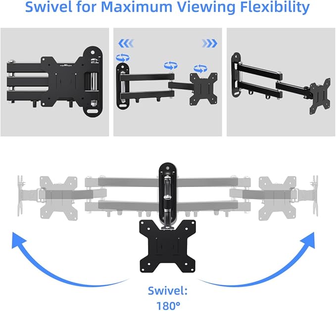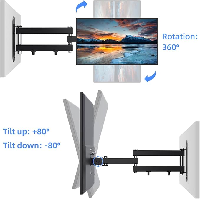 - SWIVEL, TILT, AND ROTATION: Features +80°/-80° tilt, +/-90°swivel (max. swivel angle depends on TV size) and 360° rotation for maximum viewing flexibility. Choose the best and most comfortable angle based on your viewing position.