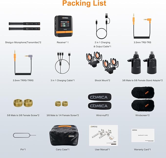 - Included Components : Shotgun Microphone(Transmitter)*2, Receiver*1, 2 in1 Charging & Output Cable*1, 3.5mm TRS-TRS Audio Output Cable*1, 3.5mm TRRS-TRRS Audio Output Cable*1, 3 in1 Charging Cable*1, Shock Mount*2, 3/8Male to 5/8Female Stand Adapter*2, 5/8 Male to 3/8 Female Screw*2, 3/8 Male to 1/4 Female Screw*2, Windscreen*2, Wind-muff*2, Pin*1, Carry Case*1,User Manual*1 Shotgun Microphone(Transmitter)*2, Receiver*1, 2 in1 Charging & Output Cable*1, 3.5mm TRS-TRS Audio Output Cable*1, 3.5mm TRRS-TRRS Audio Output Cabl… See more