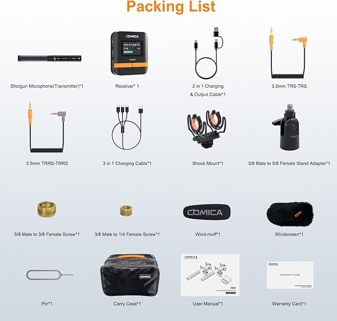 - Included Components : Shotgun Microphone(Transmitter)*1, Receiver*1, 2 in1 Charging & Output Cable*1, 3.5mm TRS-TRS Audio Output Cable*1, 3.5mm TRRS-TRRS Audio Output Cable*1, Shock Mount*1, 3/8Male to 5/8Female Stand Adapter*1, 5/8 Male to 3/8 Female Screw*1, 3/8 Male to 1/4 Female Screw*1, Windscreen*1, Wind-muff*1, Pin*1, Carry Case*1,User Manual*1 Shotgun Microphone(Transmitter)*1, Receiver*1, 2 in1 Charging & Output Cable*1, 3.5mm TRS-TRS Audio Output Cable*1, 3.5mm TRRS-TRRS Audio Output Cabl… See more