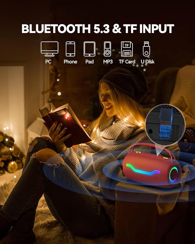 - 【Long-lasting Playtime & Extended Bluetooth Connectivity】Experience extended playtime with up to 18 hours per charge and extended wireless range with Bluetooth 5.3. The multicolor lights on the speaker can also be turned off with a simple button press to save the battery and adapt to your needs. Keep in mind that the actual playtime can vary depending on volume level, audio content, and usage.
