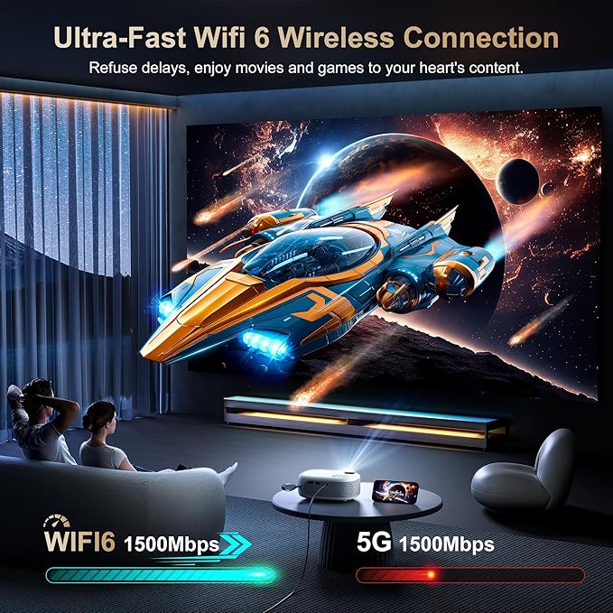 - [5G WiFi & Bluetooth 5.2 for Seamless Connectivity]: Effortlessly stream content via 5G WiFi for faster wireless speeds and smooth streaming. With Bluetooth 5.2 connectivity, the wifi projector easily pairs with external speakers, soundbars, and headphones, offering superior sound quality without external wires