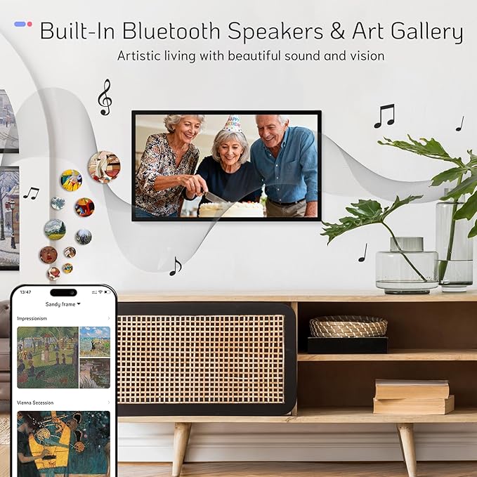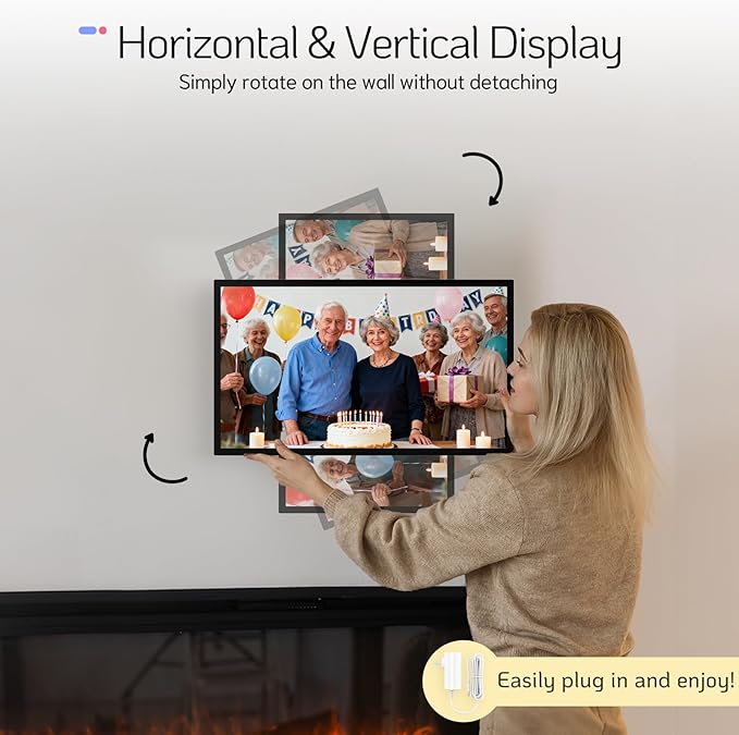 - Showcase Your Personal Gallery: NexFoto Wifi-enabled electronic picture frame (compatible with 2.4GHz and 5Ghz) brings your art collection and photo album to life on your wall. You can easily explore a diverse range of visual art, including masterpieces and NFT art. The minimalist modern design enhances your home decor, extra large digital photo frame can be freestanding or wall mounted, and its wall-mounted design featuring a swivel mount for easy rotation, providing a gallery-like viewing experience