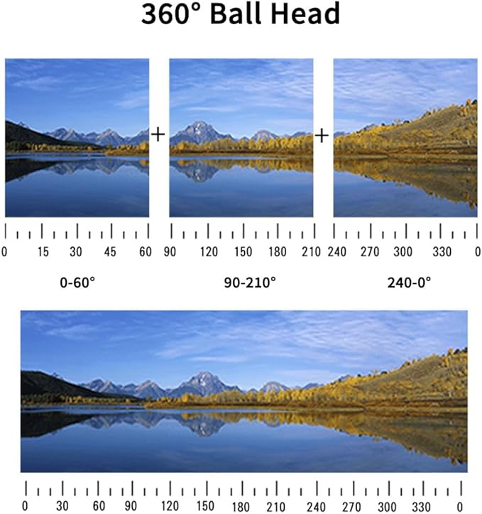 - 【360° Panoramic View】360 degree swivel ball head with bubble level and quick release plate for Arca type provide you with a panoramic view and a 90° notch for vertical shooting scenarios, allowing you to take photos at any angle with horizontally and vertically.