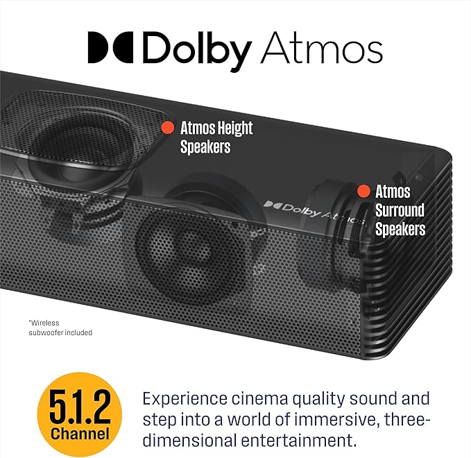 Westinghouse 5.1.2 Channel Soundbar for Smart TV, 200W Surround Sound w/Dolby Atmos & Dolby Digital Plus, Wireless Subwoofer, Home Theater Audio, eArc, HDMI, Bluetooth, Roku TV Ready
