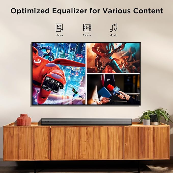 - Optimized 3 Equalizers: Comes with 3 equalizer modes: Music, Movie, and News to select your favorite specialized mode for providing you with a wide range of stereo effects throughout the room so you can enjoy cinematic surround sound in your home.