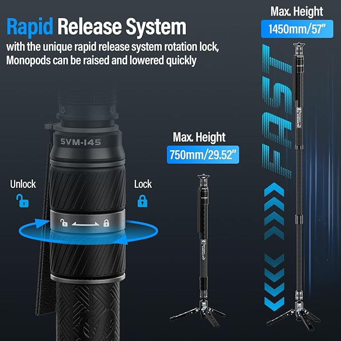 - 【Rapid One-Step Height Adjustment】: SIRUI's new rapid release system is used on SVM series monopod. You can just rotate the twist lock to fast extend or retract the camera monopod. One-step to setup shooting height to 57"/1450mm, you won’t miss any brilliant scene during fast-moving shooting.
