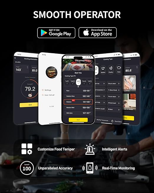 - The wireless meat probe with Ultra-thin design. Download our user-friendly app on iOS and Android devices to take command of your cooking. Set temperature alerts, track progress, and receive notifications when your dish reaches the desired temperature. Set your own custom alerts based on internal and ambient temperatures or time to fully tailor your own cooking experience.