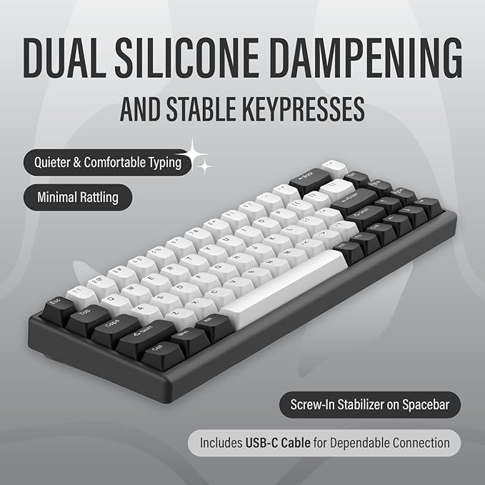 - Dual Silicone Dampening and Stable Keypresses: Dual silicone dampening for quieter, more comfortable typing; screw-in stabilizer on the spacebar and additional plate-mounted stabilizers minimize rattling; includes a 1.8m braided USB cable for dependable connection.