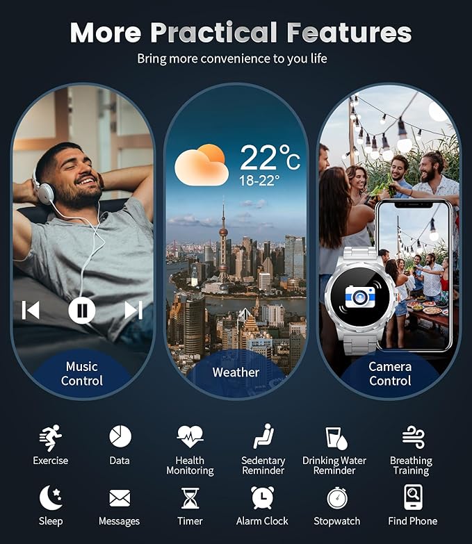 - ➤【Multifunctional Smartwatch】This smartwatch for men offers a variety of practical daily functions, including a stopwatch, timer, weather forecast, alarm clock, pedometer, phone finder, music playback, and voice assistant. It supports over 100 sports modes, heart rate, blood pressure, and blood oxygen measurement, as well as 21 language options: English, German, French, Spanish, Portuguese, Polish, Japanese, Chinese, and more.