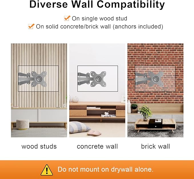 - Compatibility - compatible with VESA 75x75mm and 100x100mm, fits for concrete wall/wood stud. Do NOT mount on drywall.