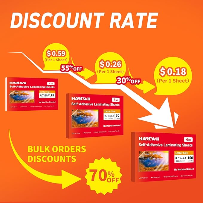 - UNIVERSAL DIMENSIONS:Hartwii Self-adhesive laminating sheets 8.7x12.2 inches ,4mil thickness ,value bulk package ,100 pack of self sealing laminating sheets ,it suitable for laminating 8.5x11 inches ,or smaller photos ,cards,labels,and stickers.